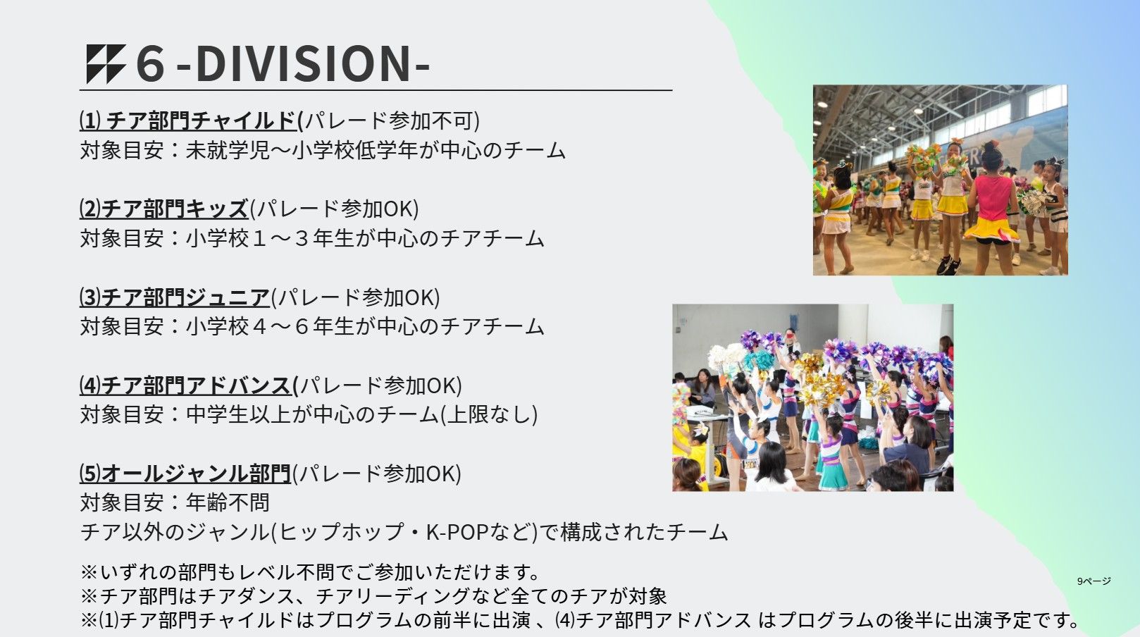 キッズ・ジュニア(小学生以下)は大会前半に出演し、表彰が終わり次第、現地解散となります。(17時までには終了予定)