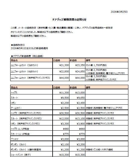 この度、メーカーの価格改定(原材料費・仕入費・輸送費等の高騰)に伴い、チアグッズの販売価格を一部改定させていただくこととなりました。